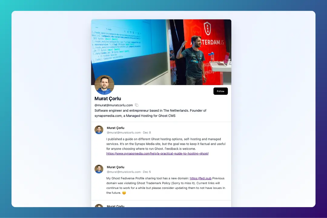 When surfing on other Ghost websites, I noticed that many people have this struggle. Since I already spent some effort on making to solve this, I thought it would be possible to make a simple profile page for all type of Ghost Social Web profiles. And here I introduce: https://fedi.pub