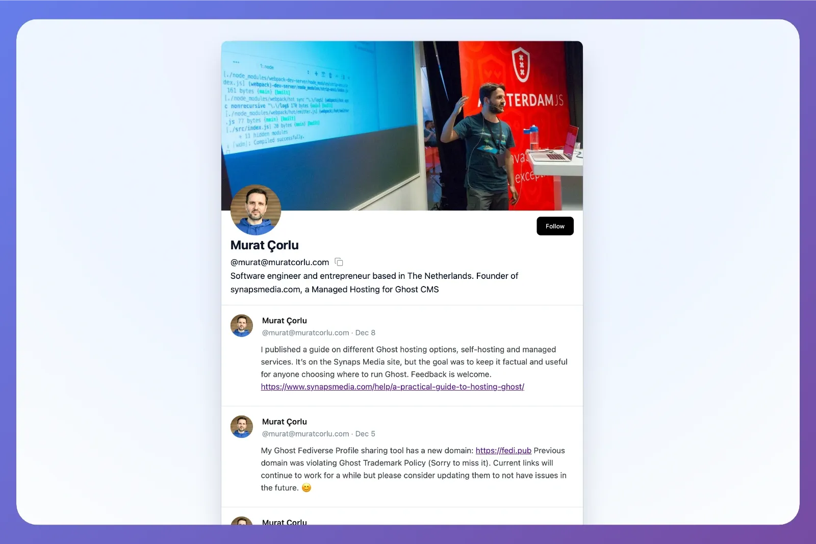 With this simple site, you can generate (well, just put your handle to the end of URL) a public profile page for your Ghost Social Web handle. With a preview and a simple guidance to how to follow you, I think this can help many of us, to take the advantage of Ghost Social Web.